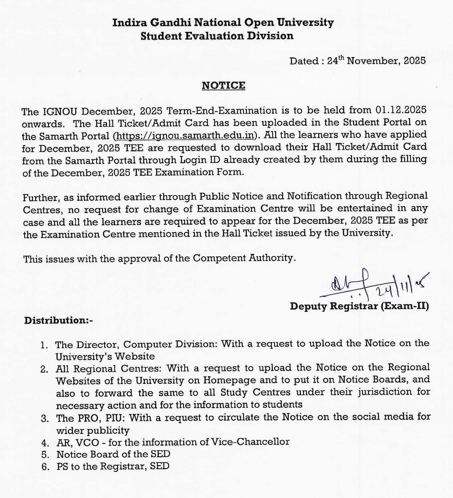 Notice regarding issue of Hall Ticket / Admit Card for June 2025 TEE