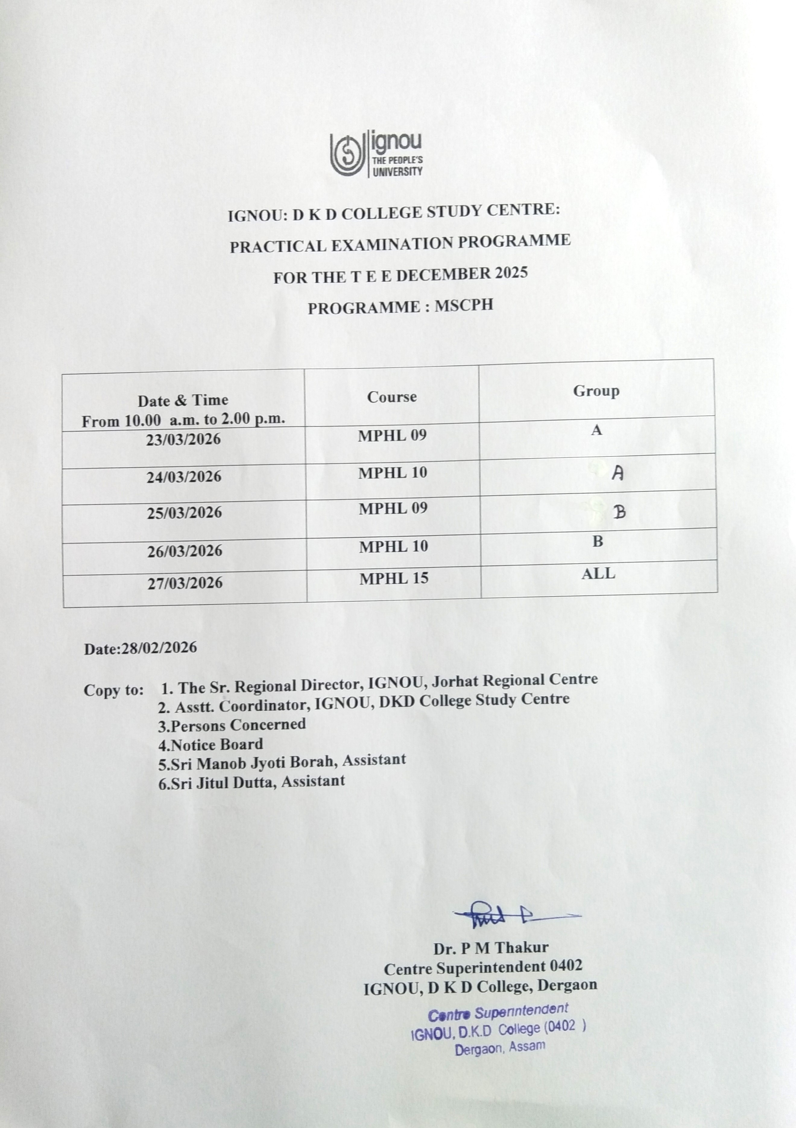 MSCPH (Physics) Practical Counselling for TEE Dec.2025 | MPHL-09 & 10 (Group-A) from 23.02.2026 to 04.03.2026 from 9:00 am to 5:00 pm | Students list | MPHL-09 & 10 (Group-B) from 05.03.2026 to 13.03.2026 from 9:00 am to 5:00 pm | Students list | MPHL-15 from 16.03.2026 to 19.03.2026 from 9:00 am to 5:00 pm | Students list | Practical Exam Date Sheet -